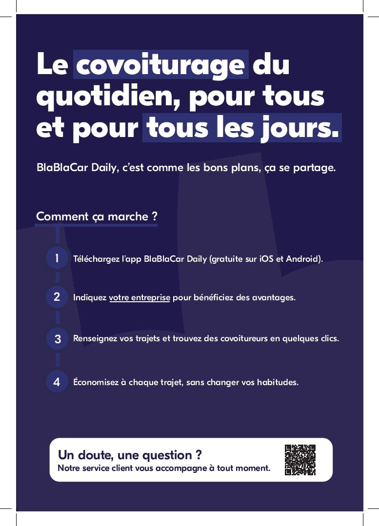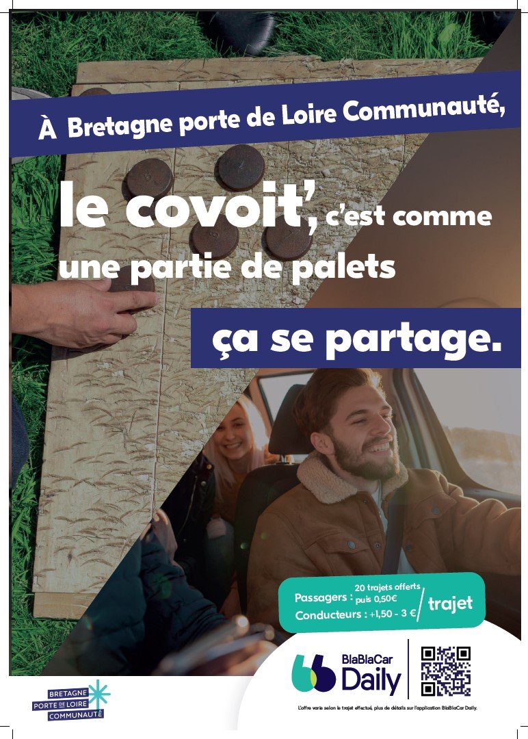 Nous vous informons du renouvellement du partenariat entre Bretagne Porte de Loire Communauté et BlaBlaCar Daily, à compter du 13 janvier 2026, afin de poursuivre le développement du covoiturage quotidien sur le territoire.