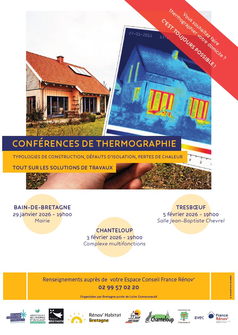 Trois conférences sont organisées fin janvier / début février pour sensibiliser aux pertes de chaleur des logements. Avec pour support, différents clichés thermographiques, la conseillère France Rénov' illustrera les principaux défauts d'isolation selon les typologies de maison et époques de construction. Elle présentera les solutions de travaux adaptées ainsi que les aides financières associées. Conférences ouvertes à tous les habitants de Bretagne porte de Loire Communauté, sans inscription, aux 3 dates suivantes :