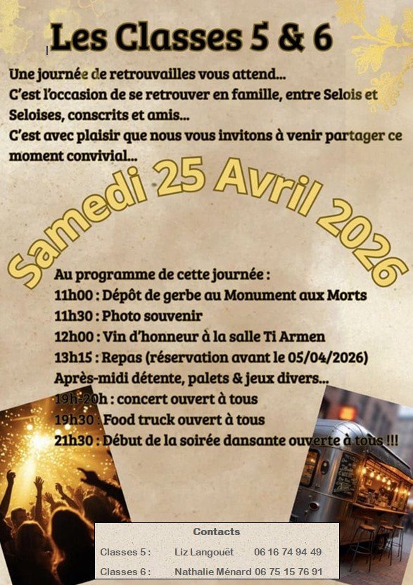 le samedi 25 avril 2026 aura lieu au Sel de Bretagne la fête de village appelée "Fête des Classes 5 et 6" !