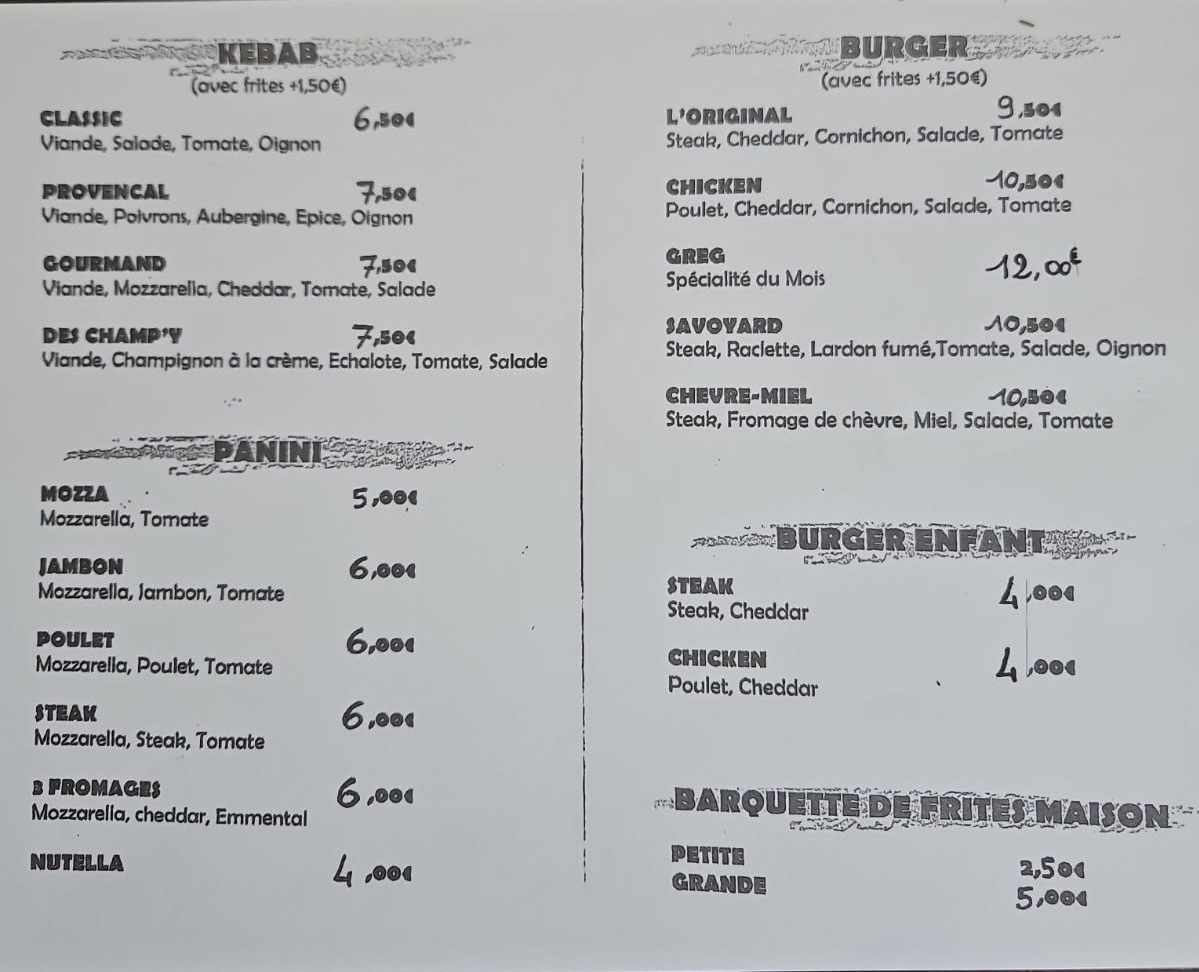 Kebab, burger, paninis le choix est large et les frites sont faites maisons !!!!!